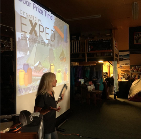 Since my adventure memoir was released in May 2016 I have unintentionally set myself on a path to a career in public speaking. I’ve hauled my Mac laptop, laser pointer and lucky water bottle from the left coast to the right coast, up to beautiful British Columbia, and through a smattering of communities along the Inside Passage as far north as Skagway, Alaska. I’ve spoken at libraries, bookstores, adventure stores, bars, community halls, universities, ferry terminals, schools, conference centers, visitor centers, bike shops, kayaks shops, and on cruise ships. One notable highlight of my speaking career was an event at the Explorers Club in New York City, where I met renowned oceanographer, explorer, author, and lecturer Sylvia Earle!